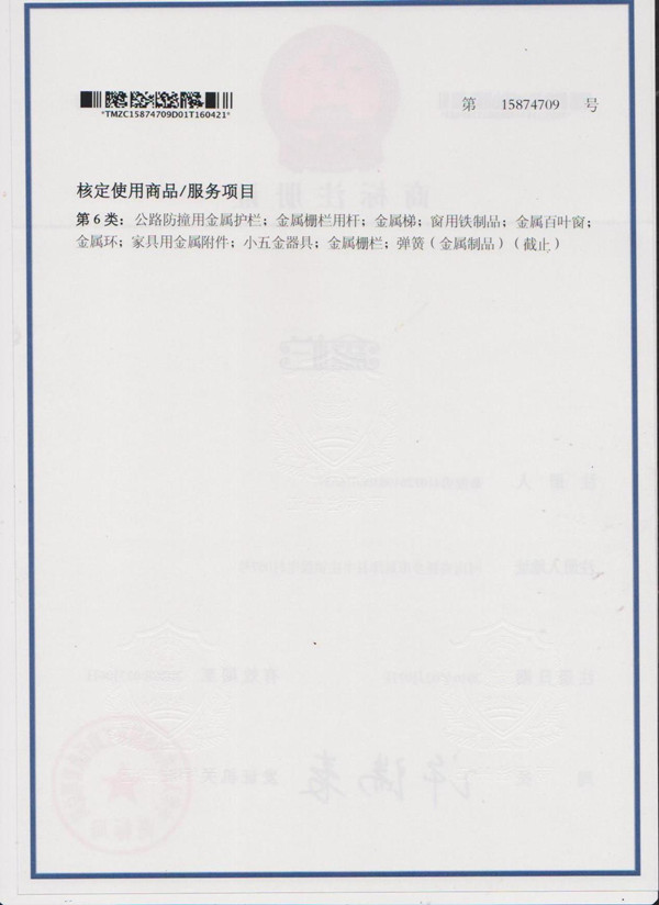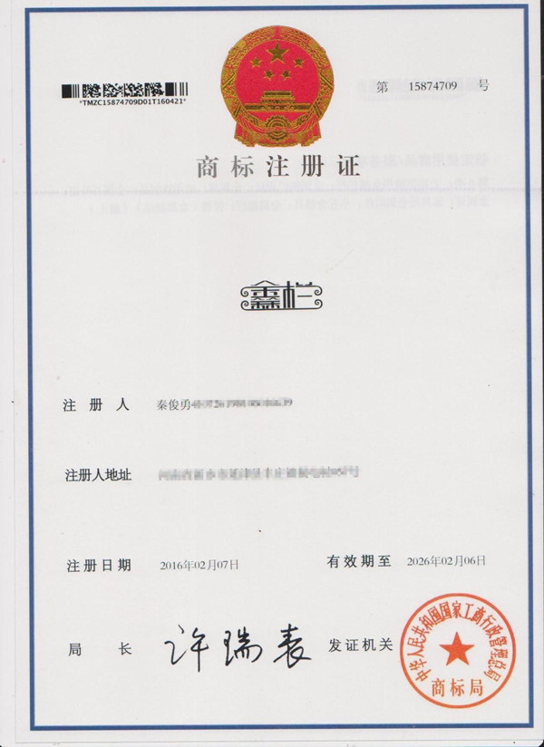 新鄉鑫欄護欄廠商標證書成功注冊下來,下面是商標證書: